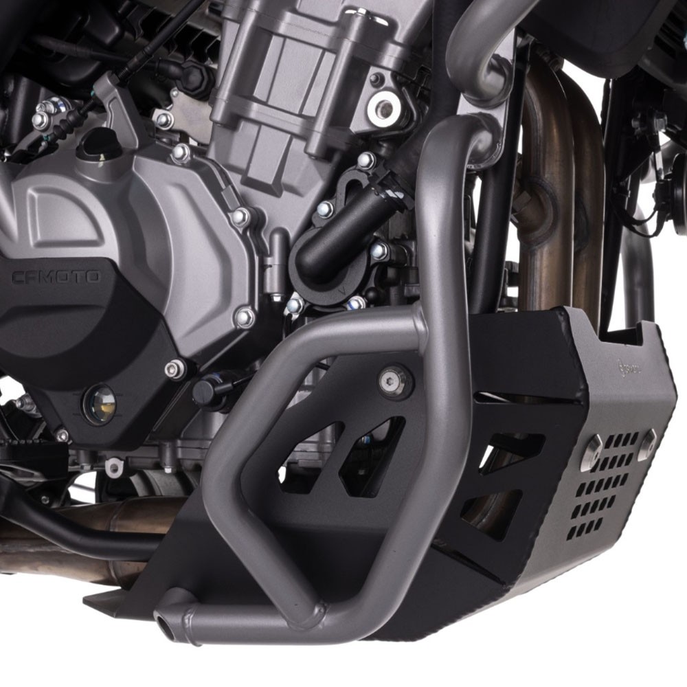 Les crash bars inférieurs CFMOTO 450MT, aussi appelés protections basses moteur, sont spécialement conçus pour protéger les zones les plus exposées de la moto lors d’une chute.