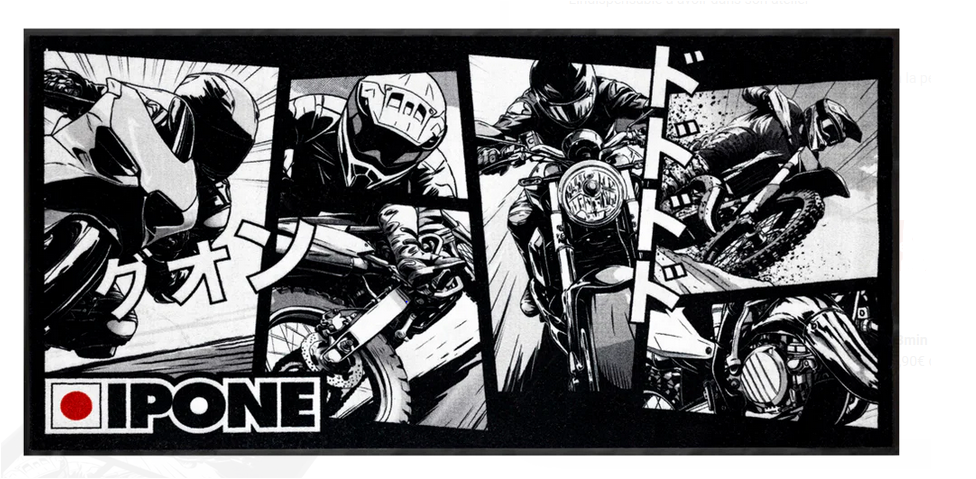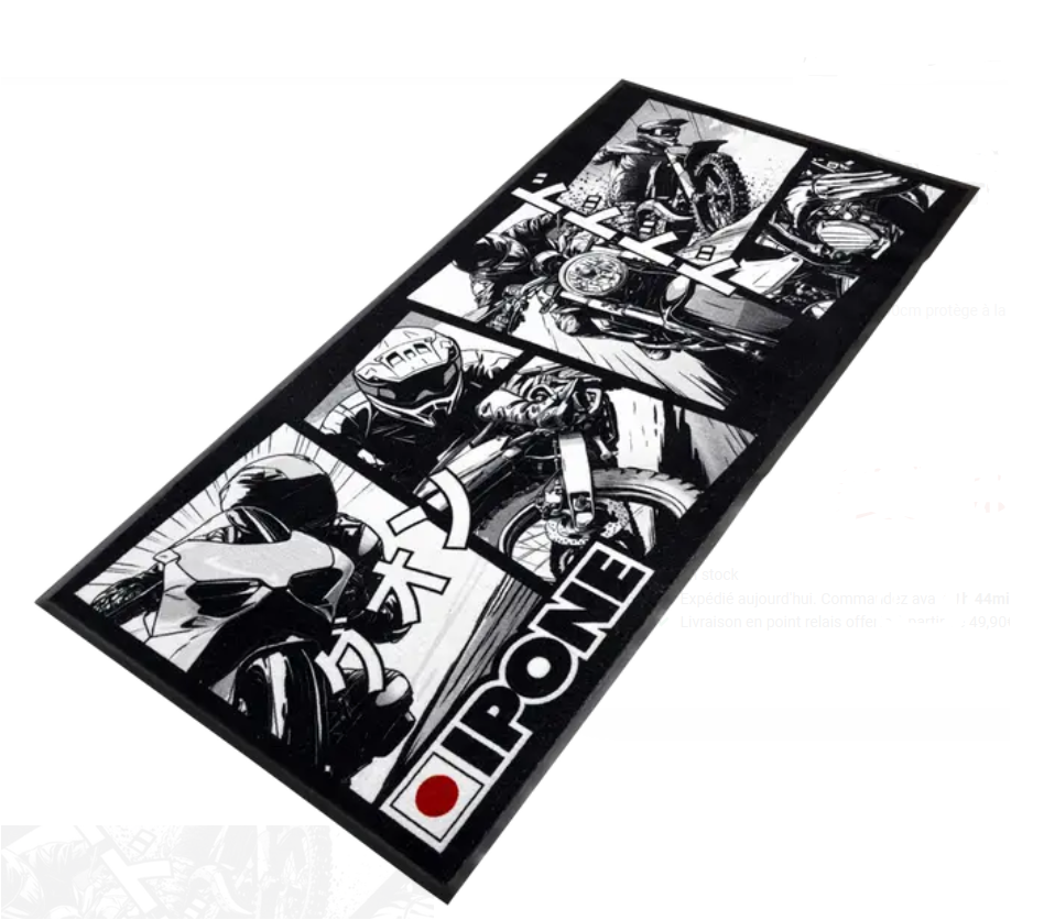 Son design unique incarne la nouvelle direction graphique d'IPONE et affirme son lien fort avec la culture Japonaise. Avec ses dimensions de 100 x 200 cm, ce tapis accueille même les plus grosses cylindrées. Il trouvera sa place aussi bien en atelier, en garage ou sur un paddock.